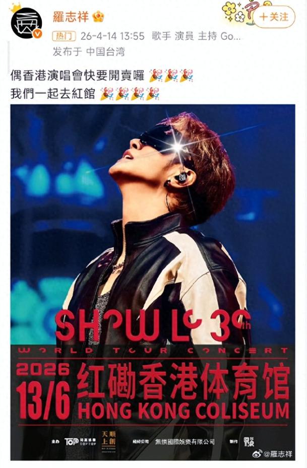 网传消息纯属恶意捏造。而更具戏剧性的是,4 月 14 日下午,罗志祥本人亲自下场,在微博上用标志性的亲民语气发文:“偶香港演唱會快要開賣囉 我們一起去紅館!” 这份突如其来的官宣,不仅用实际行动打脸了猝死传闻,更将舆论热度推向新的高峰。