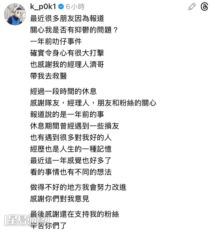 保錡表示最近很多朋友因為報道,關心他是否有抑鬱的問題,他坦言是受阿叻合照事件影響:「一年前叻仔事件確實令身心有很大打擊 ,也感謝我的經理人濟哥帶我去救醫,經過一段時間的休息,感謝隊友,經理人,朋友和粉絲的關心。」他又指休息期間遇到一些損友,也有遇到好的人,一切經歷也是人生的一種記憶,並謂:「最近這一年感覺也好多了,看的事情也有不同的想法,做得不好的地方我會努力改進。」最後,他感謝大家給予的意見,以及粉絲的支持。