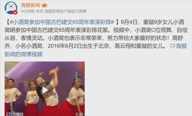 9月4日,小酒窝还晒出参加中国古巴建交65周年表演彩排花絮。从视频中可以看到,小酒窝站在C领舞,表情甜美灵动,动作自作从容,让人印象深刻。