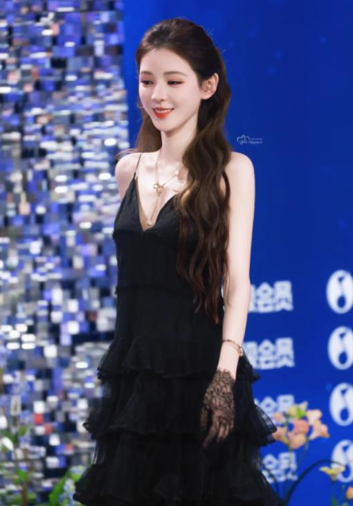 当天她穿了一身黑色丝绒贴身礼裙,领口是简约的V领设计,款式简约却难掩气质。
