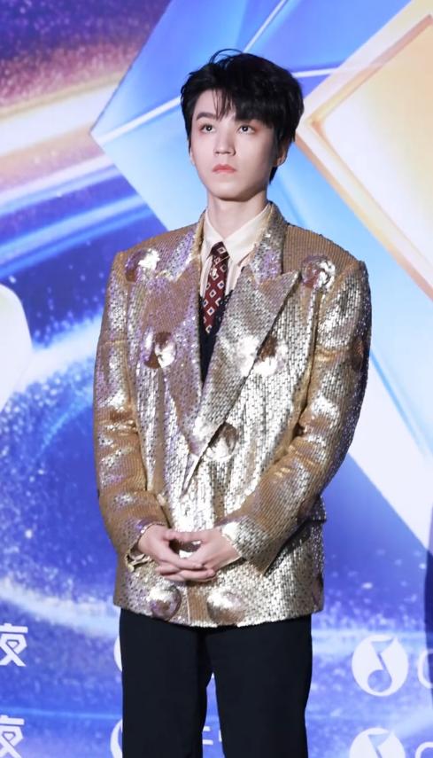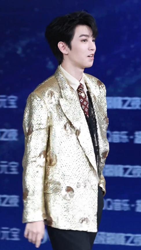 王俊凯穿了一身金色亮片西装,搭配一条暗红色领带,领口处还别了一枚银色胸针,单看款式,贵气十足,符合他压轴的身份。