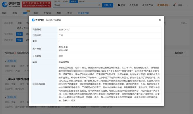 天眼查App显示,近日,法院刊登祁某某向王俊凯致歉的公告。公告显示,2023年1月,祁某某没有经过核实,使用自己的账号在网上发布了关于王俊凯先生“假唱”“恋情”“不正当关系”等严重不实的内容,误导了网友,影响了其社会评价,严重损害了其名誉,对此祁某某深表歉意。祁某某已充分认识到自己的错误,对于网络上没有任何依据的小道消息没有认真思考就转载转述,伤害他人的同时也违反了法律规定,对此深感愧疚和自责,并再次郑重地向王俊凯道歉,请求王俊凯的原谅。