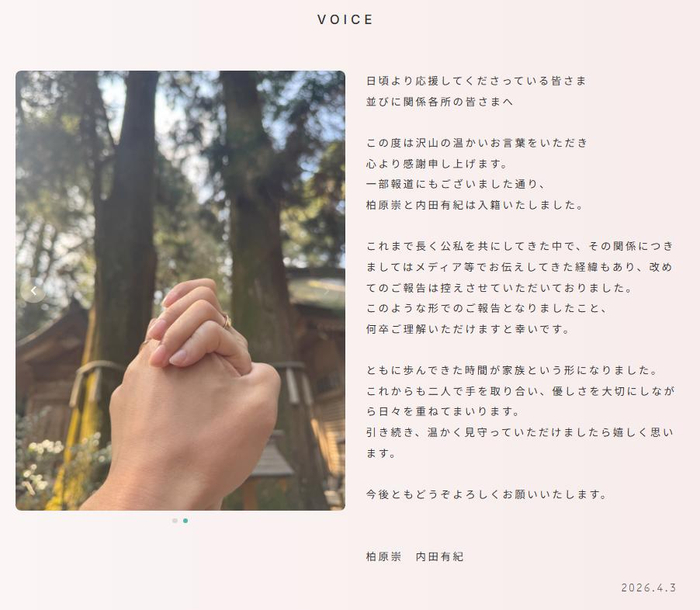 内田有纪与柏原崇在4月3日的联名公告中向送出温暖祝福的各方人士表达了感谢,并郑重宣布了两人结婚的消息。公告称:“正如部分媒体报道所述,柏原崇与内田有纪已经办理了结婚登记。在我们长期共同度过工作与生活的过程中,这段关系曾通过媒体等有所传达,因此我们一直未再另行正式报告。此次以这样的形式向大家说明,还望能够理解。”