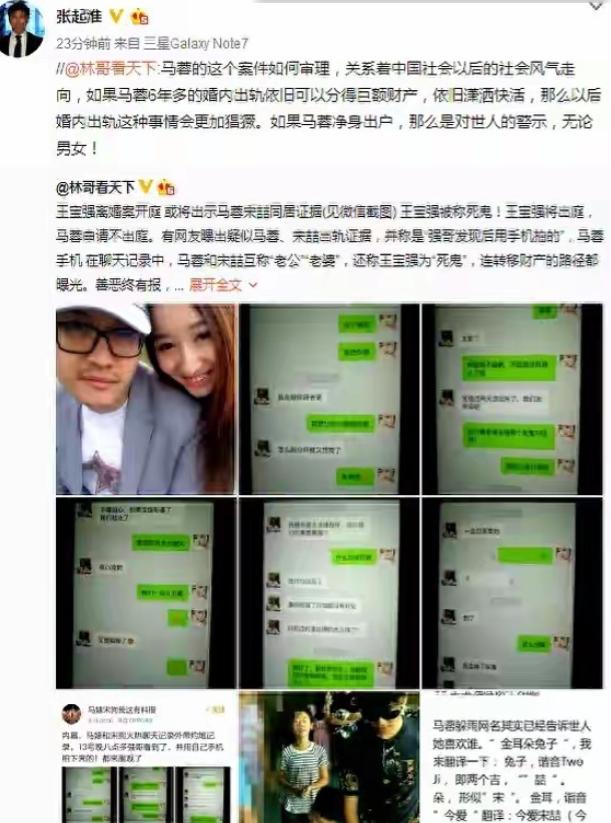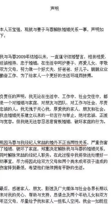 2016年8月,王宝强在微博上发了一条措辞平静但内容惊人的声明,宣布与马蓉离婚,并直接点出了马蓉与宋喆之间存在不正当关系,同时提到了财产被侵占的问题。