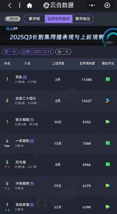 剧集播出期间虽未成爆款,但长期位列云合数据霸屏榜TOP30,收官50天后仍逆跌冲上榜单前四。弹幕量超1000万,观众黏性显著。