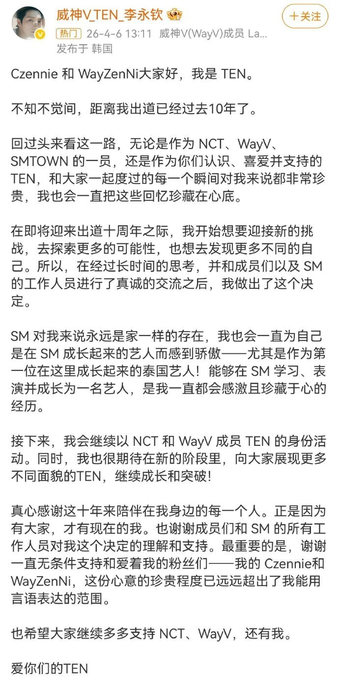 #TEN将积极协调参与威神V及NCT活动#终于等到这个回应,以后又能在威神 V 和 NCT 里见到李永钦了。#李永钦会继续以NCT和WAYV成员身份活动##TEN李永钦不续约#