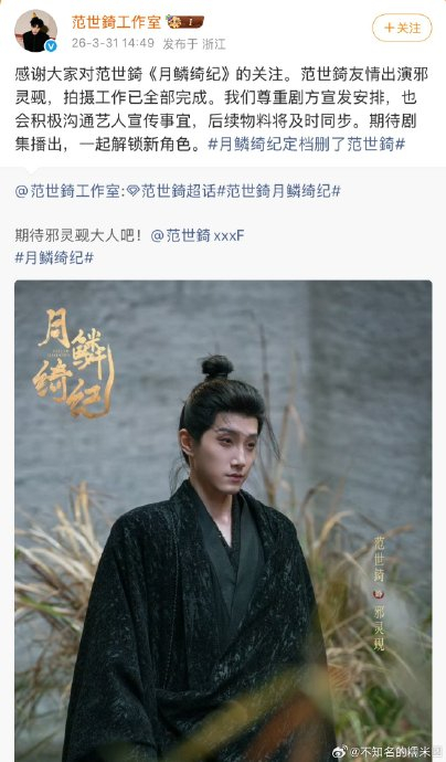 2026年3月31日,古装剧《月鳞绮纪》正式官宣定档4月1日优酷独播,然而眼尖的网友发现,曾在杀青物料中明确标注为“第二单元友情主演”的演员范世锜,其名字竟从定档海报、演员名单及宣传文案中完全消失,引发舆论哗然。