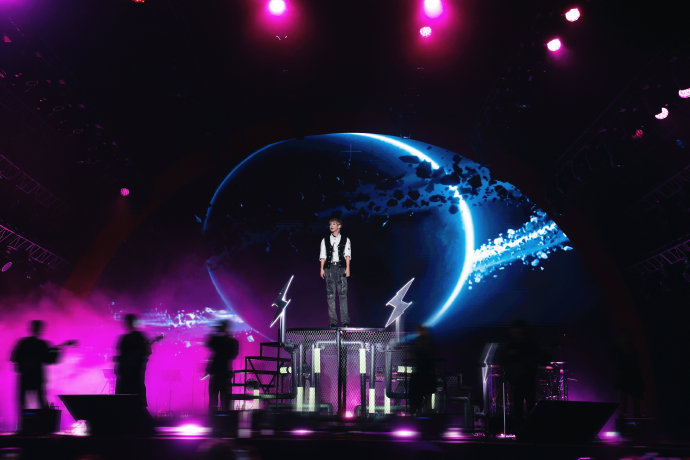 汪苏泷以《梆梆》的强劲节奏揭开演出序幕,标志性的嗓音瞬间穿透夜幕。电子音效与鼓点交织中,舞台激光束划破黑暗,观众随节拍跳跃,荧光手环汇成流动光海。紧随其后的《娱乐世代》延续亢奋情绪,他身穿镶钻机能风夹克登场,号召全场“告别前要跳舞”,复古迪斯科旋律引发千人齐舞。