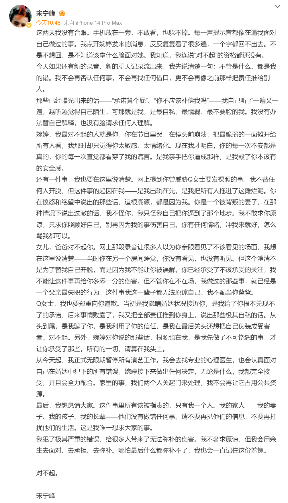 ### 宋宁峰的两段婚姻:一面照见爱情困局的镜子,在这场刷屏的道歉信中,宋宁峰的前两段婚姻像一面镜子,照见了他与爱情、婚姻之间的全集,从齐溪这段“白月光”般闪耀的爱情,到张婉婷这段充满歧义的婚姻,宋宁峰的故事不仅是个人的情感历程,更折射出当代人在爱情与责任面前的迷失与觉醒。,#### 一、前婚的闪光点:双向奔赴中的尊重与责任,宋宁峰与齐溪的婚姻,是一段“双向奔赴”的典范,从《浮城谜事》这部电影相识,到三次求婚、精心策划的婚礼,宋宁峰用行动诠释了深情,他的爱是热烈而执着的,用改名、求婚、婚礼策划等方式表达对齐溪的眷恋,婚后的生活更是“模范夫妻”,彼此尊重、相互支持,齐溪的事业蒸蒸日上,宋宁峰从未有过丝毫嫉妒和贬低。,即便走向离婚,宋宁峰依然保持了体面与尊重,这种成熟的态度,也成为了他人生中的一面镜子,与之形成鲜明对比的是张婉婷那段婚姻。,#### 二、后婚的困局:仓促结合与双向消耗,与齐溪的婚姻不同,宋宁峰与张婉婷的结合更像是一场仓促的联姻,一时的责任感和情感压抑,让他在未婚先孕后,仓促领证,整个婚姻过程中,宋宁峰始终保持着被动和愧疚的心态,而张婉婷则用强势和控制来索取安全感,这种互相消耗的婚姻模式,最终演变成了“越指责越沉默,越沉默越指责”的恶性循环。,#### 三、镜子效应:爱情的真相与困局,前婚的镜子照见了宋宁峰与齐溪婚姻中的尊重与双向奔赴,也照出了后婚中对爱情的误读与消耗,宋宁峰的爱与责任在齐溪身边显得纯粹而真诚,却在张婉婷面前变得愧疚与捆绑,这面镜子揭示了一个深刻的真相:好的婚姻不是靠愧疚和隐忍维系,而是靠双向奔赴、互相尊重和坦诚沟通。,#### 四、吃瓜感受:现代人情感困局的缩影,宋宁峰的两段婚姻,正是无数普通人的情感困局的缩影,在前婚中,他学会了用深情和责任经营婚姻;在后婚中,他却陷入了被动与愧疚的泥潭,这不仅是个人选择的结果,更是整个时代的情感困境。,#### 五、爱情从来不是单方面的付出,宋宁峰的故事提醒我们:好的婚姻从来不是找到完美的人,而是学会用正确的方式经营自己的人生,从齐溪的尊重到张婉婷的消耗,我们看到了爱情的两面:它既需要热烈的奔赴,也需要冷静的经营;既需要深情的付出,也需要理性的选择。,宋宁峰的道歉或许来得晚了,但他的人生经历无疑给我们带来了深刻的启示:爱情的真谛,不在于你给我什么,而在于你如何经营好自己的人生;婚姻的美好,不在于你有多少,而在于你如何用尊重与理解经营这段关系。