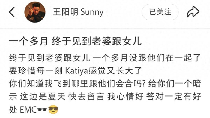 昨天(2月10日),台湾演员王阳明在社交媒体上激动地分享了一条动态。他高兴地表示,时隔一个多月终于和妻子蔡诗芸及女儿Katiya团聚,珍惜与家人共度的每一刻,并感叹女儿Katiya又长大了。他还故作神秘,向粉丝抛出了一个小谜题,暗示大家猜猜自己现在到底身处何地。