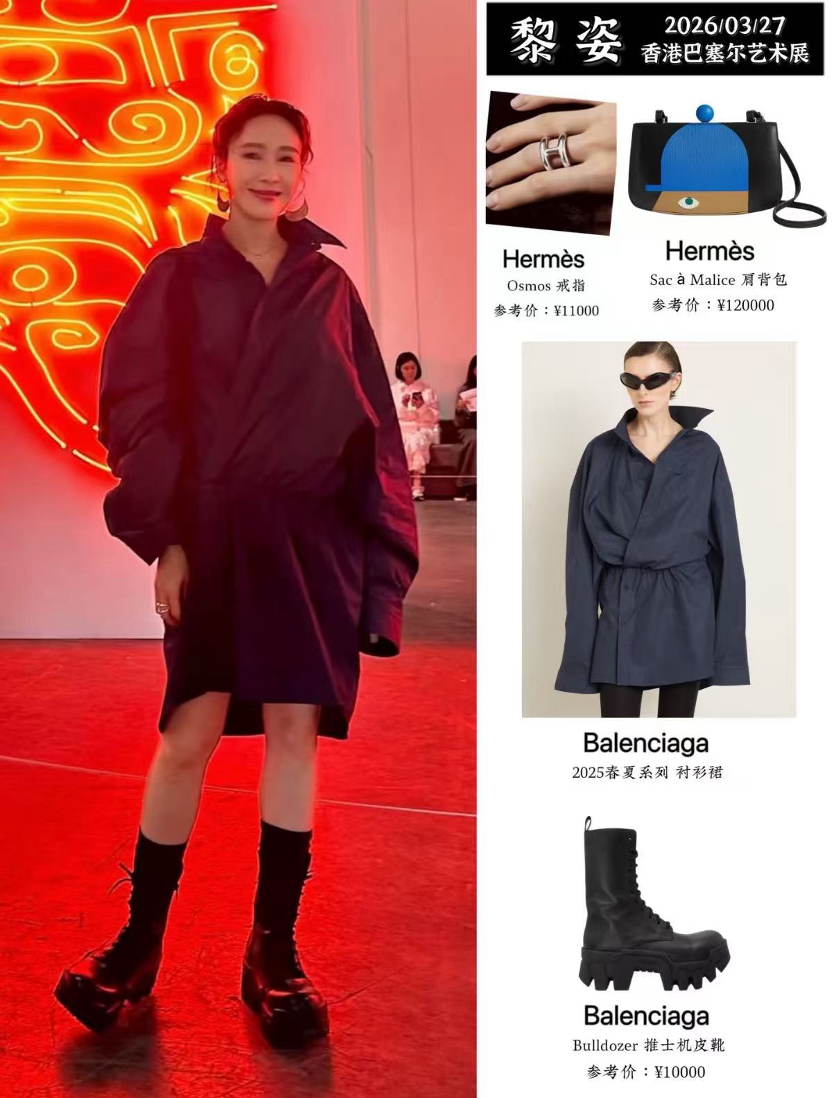 黎姿身穿深蓝色连衣裙,搭配同品牌的靴子,造型简约优雅。