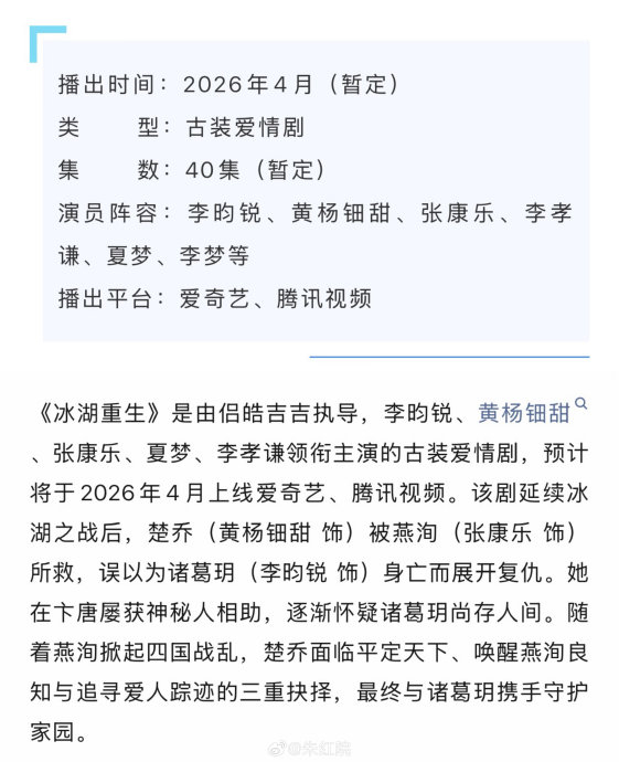 古偶赛道竞争白热化:2026年多部S+古装剧(如《月鳞绮纪》《金枝》)同期竞争,观众审美疲劳下,《冰湖重生》需以差异化亮点突围。