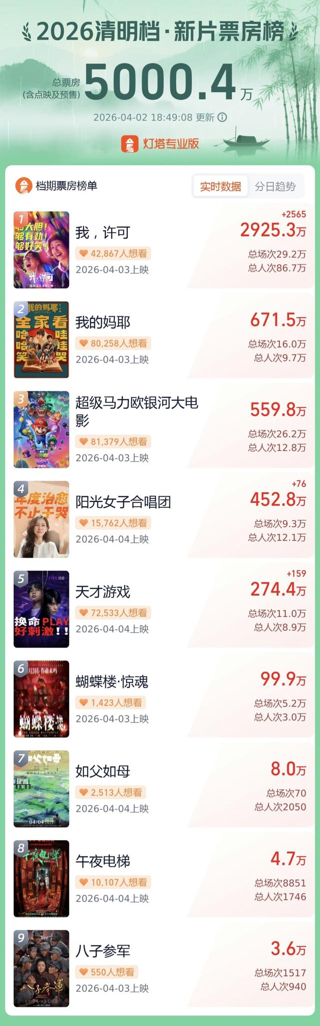 2026年清明档再现“小片扎堆上”局面。今年共有18部影片定档清明档,有9部都是小成本恐怖片。另一方面,众多与亲情、友情有关的电影点映口碑不俗,撑起清明档的重要声量。据灯塔专业版统计,截至4月2日18时49分,2026年清明档新片点映及预售总票房突破5000万元,影片《我,许可》《我的妈耶》《超级马力欧银河大电影》《阳光女子合唱团》《天才游戏》暂列前五。其中《我,许可》预售票房超2900万元占比过半。影片聚焦母女关系话题,女性想看占比高达93.2%。