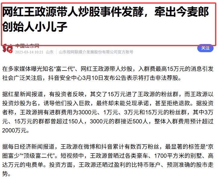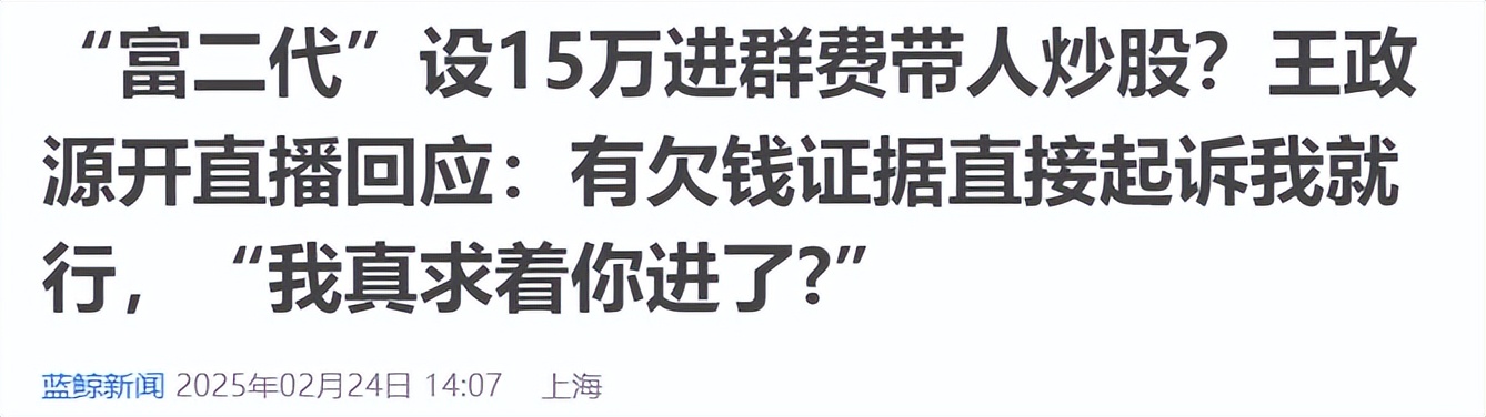 蓝鲸新闻|“富二代”设15万进群费带人炒股?王政源开直播回应:有欠钱证据直接起诉我就行,“我真求着你进了?”