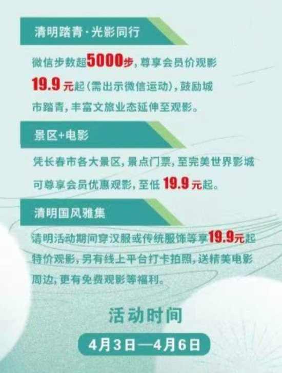 惠民观影活动力度十足。长春完美世界影城推出“清明踏青·光影同行”系列特惠,4月3日—6日,市民微信步数超5000步、持长春景区门票或身着汉服等传统服饰,均可享19.9元起特价观影,线上打卡还可赢取电影周边及免费观影机会,实现文旅与观影联动。长影影城(欧亚三环店)、长影影城(欧亚世纪店)配合所在商圈活动,设置19.9元优惠观影、甜品特惠等福利,同时提供凭票免费停车服务,进一步优化市民观影消费体验。