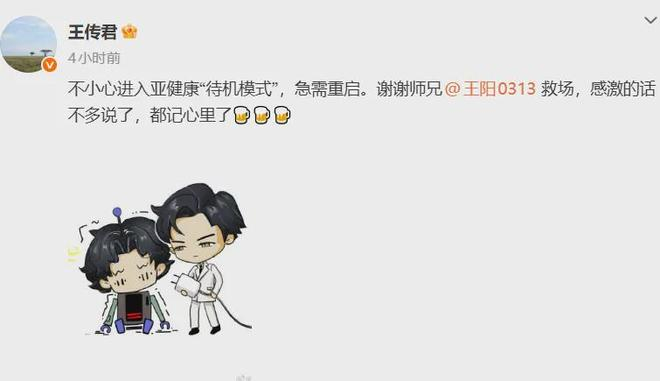 近日,演员王传君在社交平台上发布了一则引人关注的消息。他在微博中表示:“不小心进入亚健康‘待机模式’,急需重启。谢谢师兄@王阳0313 救场,感激的话不多说了,都记心里了。”
