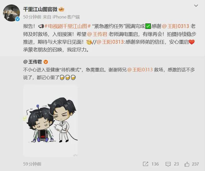 与此同时,电视剧《千里江山图》官方微博也发声:“报告!# ‘紧急邀约任务’圆满完成✅感谢@王阳0313 老师及时救场,入组接演!希望@王传君 老师满电重启,有缘再会!拍摄持续稳步推进,期待与大家早日见面。”