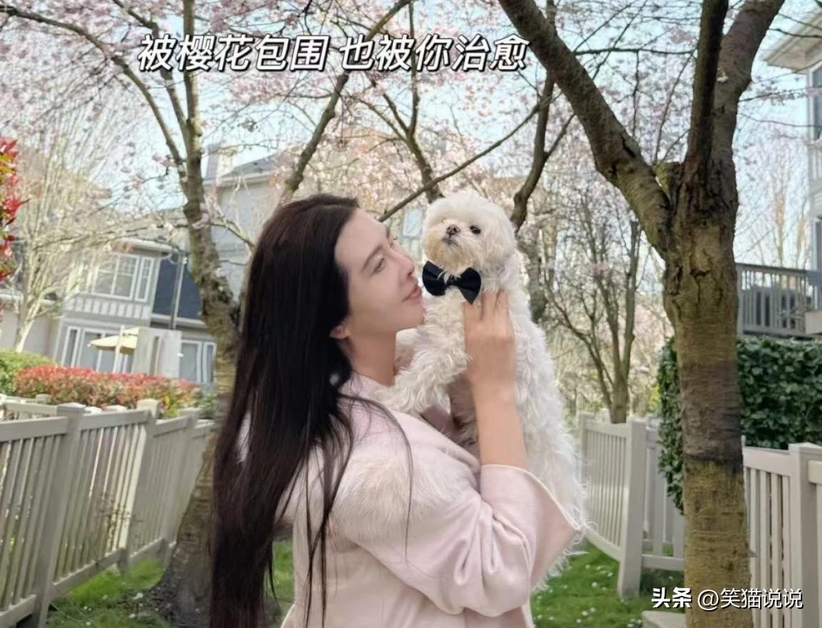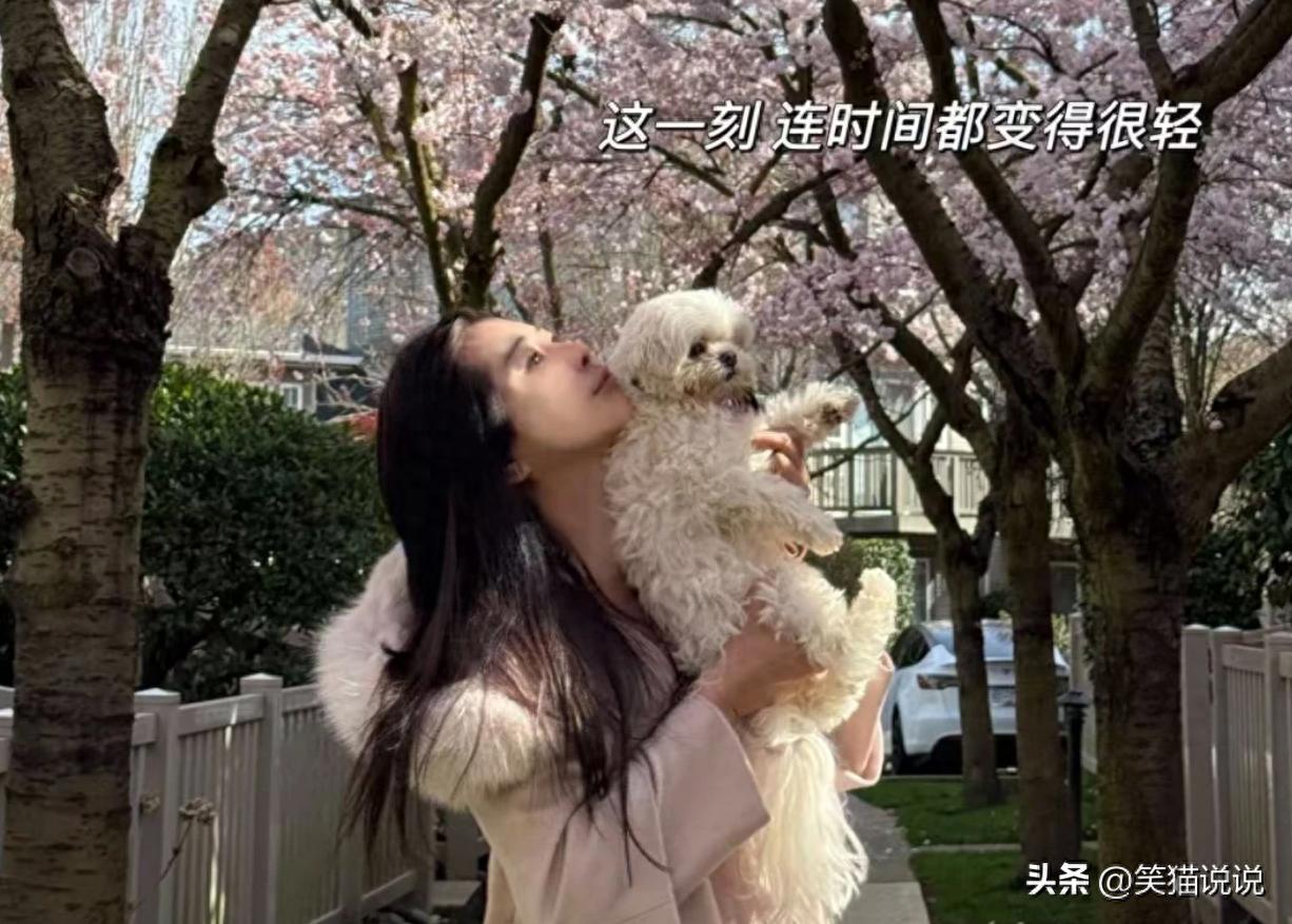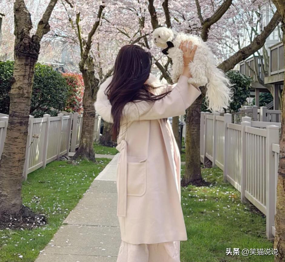 王祖贤抱着她的爱犬智悟来到街道上的樱花树下,她一边抱着爱犬智悟晒太阳,一边欣赏着这樱花的美景,这画面很温馨美好。天气很不错,阳光也很灿烂,花也开的很漂亮,确实很适合外出散步晒太阳。