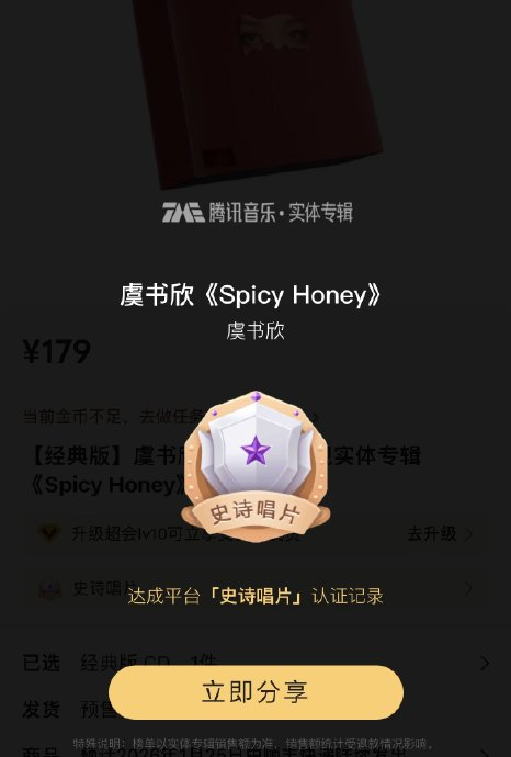 2026年3月23日,虞书欣首张个人实体专辑《Spicy Honey》以突破6000万元的总销售额,斩获QQ音乐平台最高等级“史诗唱片”认证,成为内地首位且唯一解锁该成就的女歌手,刷新内娱女艺人实体专辑销售纪录。