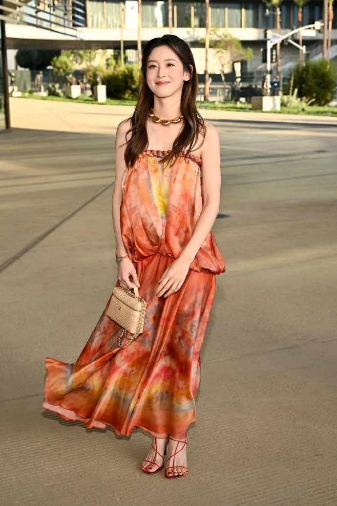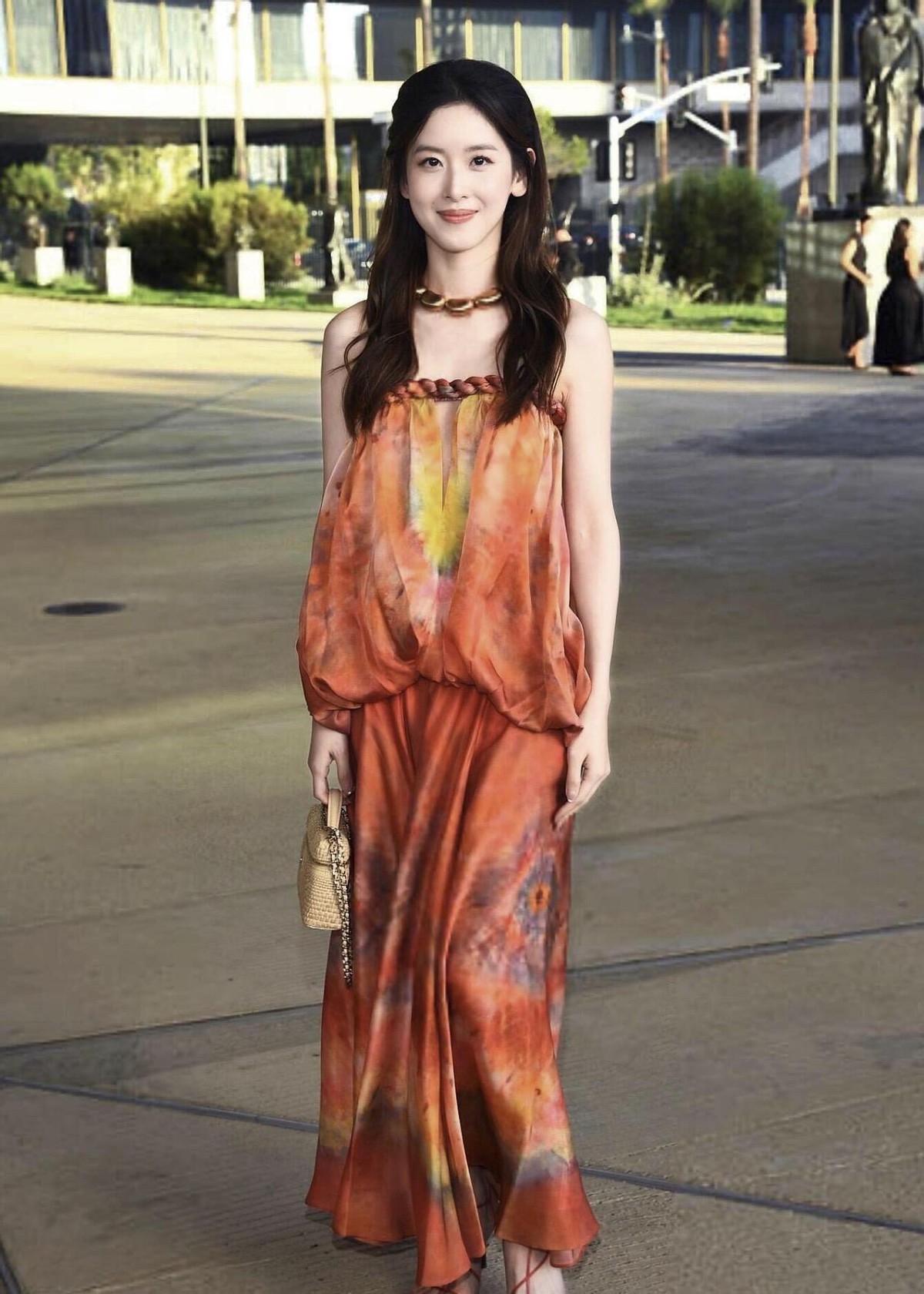 这一身抹胸连衣裙的搭配,让章泽天直接美成了 “人间落日”,一件橘黄渐变的扎染吊带长裙,像把整片晚霞穿在了身上,上半身是抹胸的设计,编织绳的领口带着度假风的随性,搭配垂坠感的缎面裙摆,走路时自带柔光滤镜,完全没有刻意的精致感,却处处透着松弛贵气。