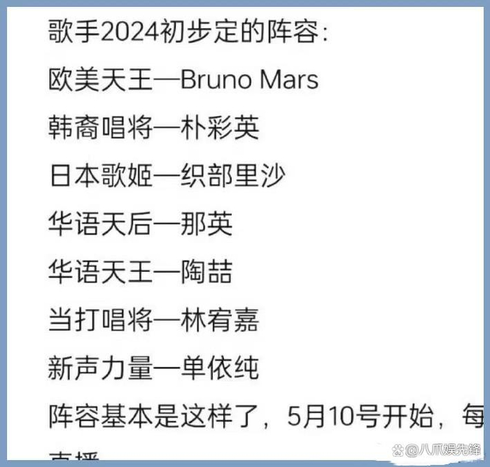 而且直播也会有更多不确定因素出现,对嘉宾和节目组来说都是更大的考验,作为纯音综,嘉宾的人选自然决定着一季节目的好坏,在《歌手》回归的消息传出后,网上关于嘉宾名单的讨论就一直没有停止过。随着《歌手2024》的正式启动,网上关于节目的完整拟邀名单也浮出了水面,由天后那英、天王陶喆、欧美天王Bruno Mars、韩裔唱将朴彩英、日本歌姬织部里沙、当打唱将林宥嘉和新生力量单依纯组成七人嘉宾阵容。