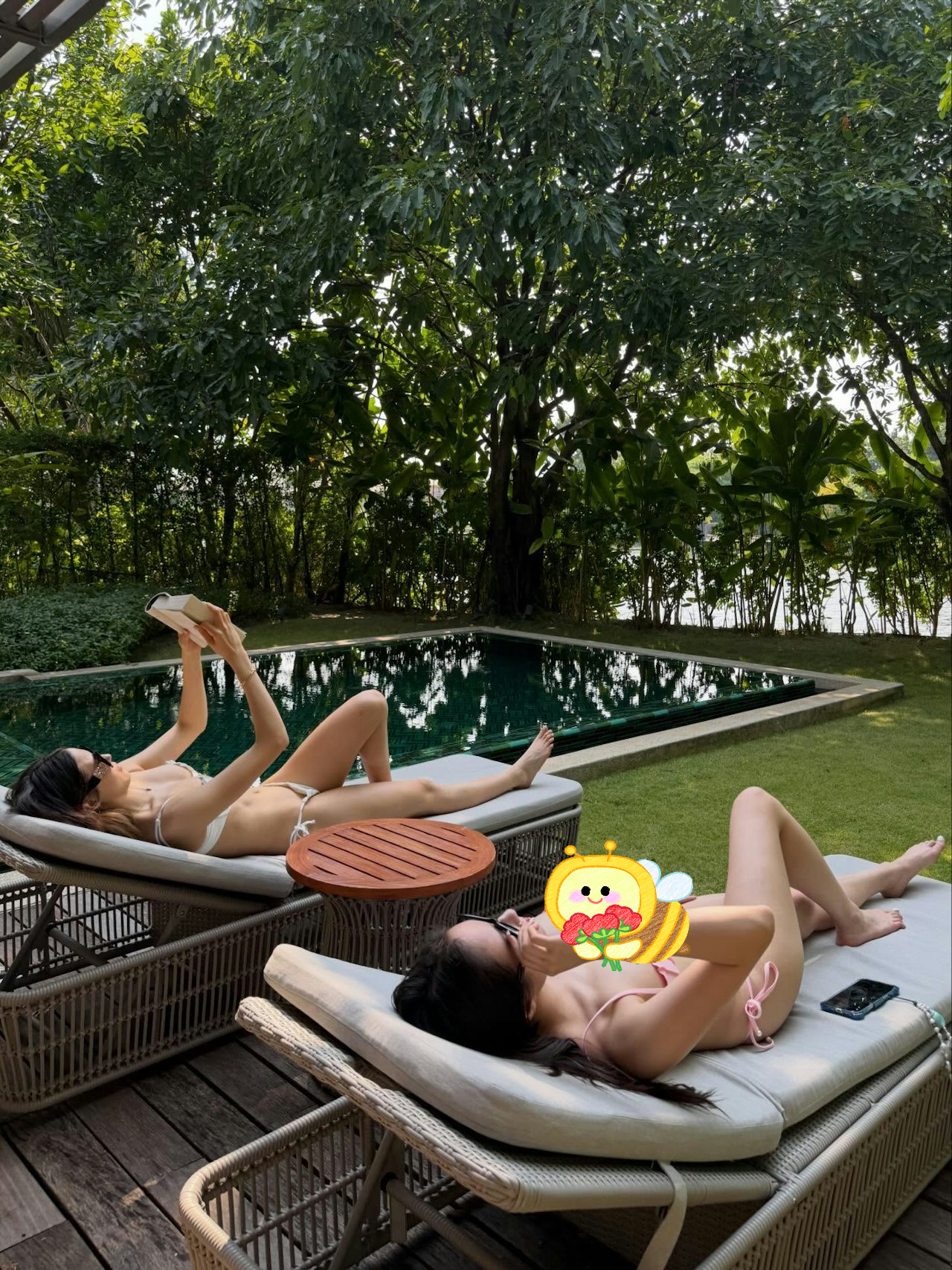 除了游泳,水上运动,也不少不了的是日光浴,何超欣也出镜了。从谷爱凌晒出的照片可见,她与何超欣打扮清凉,在泳池边的躺椅上惬意地享受放松时光。谷爱凌还不忘拿着一本书在阅读,而何超欣躺在一边放空自我。此外还有一张是两人正面镜头的照片,只见何超欣盘腿坐在椅子上,谷爱凌拿着书趴躺在长椅上,尽显妩媚。两人都不吝啬地展露出了好身材,对着镜头自然微笑,展露出健康之美。