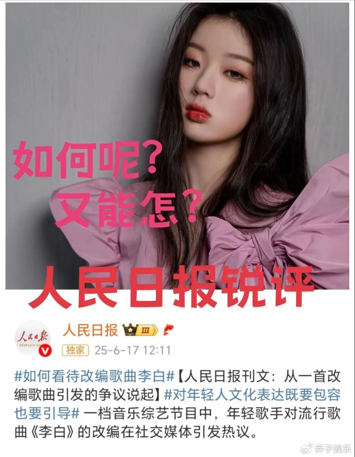 去年单依纯改编演唱的《李白》爆火时,争议就很大了,人民日报还锐评过,那会态度还蛮中肯的,但是在节目有版权下的改编。
