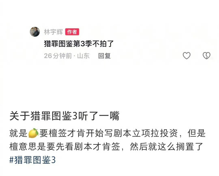 林宇辉回网友评论时候说:檀健次的《猎罪图鉴3》不拍了。这部戏继续拍下去应该可以称得上他的养老剧,但有人爆料说:柠萌要檀健次确定演了才开始写本子,而檀健次方要求看全本才行,双方僵持不下。 但是内娱能看全本的艺人很少,孙俪这种大咖都不一定能看全部剧本,但有网友分析说是因为之前舆情的问题,导致大厂不敢冒险。 怎么看?