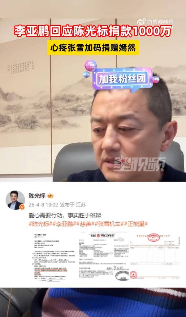 这场公益风波可谓是“吃瓜”无限升级,堪称一场“慈善版”的“全民追星”狂欢,从陈光标的“千万捐款”到张雪的“赛车拍卖”,这场救助嫣然天使儿童医院的公益行动,堪称“慈善界”的新地大盘。,陈光标的“100万捐款”可谓是“直接开挂”,这笔捐款不仅点燃了网友的热情,也让“慈善捐赠”再次成为公众视野中的“高光时刻”,谁能说这笔善举没有一丝“虚假”的影子呢?毕竟,在慈善捐赠这块,光靠“钱”是远远不够的,还需要“真心”与“真材”。,就在陈光标的捐款风波风靡一时之际,张雪机车创始人张雪一鸣惊人,宣布将拍卖一台极具“赛道感”的冠军赛车,全部所得捐赠嫣然天使基金,这种“加码支持”无疑让“嫣然天使”这一公益项目的“筹款小目标”被“秒杀”,更让“慈善吃瓜”达到了一个新的高度。,值得一提的是,这台赛车可是“实打实”的“冠军赛车”,与张雪在WSBK葡萄牙站夺冠时的赛车一模一样,虽然因为改装无法上牌,但配备的“藏品”却堪称“收藏界”的“终极绝唱”,包括分站冠军奖杯、最快圈速奖杯,以及张雪亲笔签名的“冠军帽子”,这些“情怀拉满”的收藏品无疑让拍卖成为“拍王”和“鉴赏家”的“终极天堂”。,更有意思的是,李亚鹏在直播中对这场“公益接力”表现出了“复杂”的心态,他对张雪的捐赠表达了“衷心感谢”,但另一方面,他也透露了自己“不方便”参与拍卖,并调侃道:“如果最终是自己的朋友拍到了,他已经商量好‘把奖杯给张雪送回去’”,更令人忍俊不禁的是,他在提到这笔捐赠时,竟然直白地说:“拿出来拍卖替他心疼。”这句话简直是“吃瓜界”的“一记炸弹”,让人忍不住为“标哥”捐款的“光环”感到“心疼”。,从“标哥”的“千万捐款”到“张雪”的“赛车拍卖”,这场公益行动无疑让“嫣然天使”基金的“筹款目标”被“秒杀”,也让“慈善吃瓜”达到了一个新的高度,除了“吃瓜”的乐趣,更让人深思的是:在公益背后,是否也隐藏着一些“商业化”与“圈层化”的影子?毕竟,毕竟“慈善”本应是“无私”的,但“圈层化”与“商业化”似乎也在悄然挤占着这一领域。,无论如何,这场公益风波无疑让“吃瓜”达到了一个新的高度,也让人们看到了“慈善”背后更复杂的“面貌”,正如李亚鹏所说:“替他心疼”,或许这不仅仅是对一份荣誉的不舍,更是对这份沉甸甸支持的珍视。## 李亚鹏回应陈光标捐款100万"已经到账",张雪赛车捐赠"替他心疼"——一场围绕嫣然天使基金的吃瓜狂欢,李亚鹏在直播间里一边嗑着瓜,一边回应了陈光标的慈善捐赠消息,直接把这场公益风波推到了聚光灯下,事情的起因是一如既往的陈光标慈善动作,他这次又一次给嫣然天使儿童医院出了大名,捐了100万元,这一次的慈善动作似乎有些不太寻常,捐款的用途明确吗?能不能变现?这些问题立刻在网络上炸开了锅。,4月9日晚,在李亚鹏的直播间里,"标哥的钱是真金白银捐了100万元,已经到账了",这句话简短而有力,直接回应了网友们的质疑,更有趣的是,李亚鹏还补充说,这笔捐款没有任何限定,用途是全力支持儿童医院,他的语气明显带着一丝无奈,仿佛在说:"你们懂不懂啊,这事儿我可没什么可隐藏的。",在李亚鹏这样"澄清"的同时,另一场慈善接力也悄然发生了,就在前一天,"张雪机车"创始人张雪在社交平台上宣布,他要拍卖一台极具纪念意义的复刻赛车,全部所得捐给李亚鹏指定的嫣然天使基金,这张赛车可是有一定的背景的,它和张雪在WSBK葡萄牙站夺冠的赛车一模一样,虽然改装后无法上牌,但张雪会为它配备亲笔签名和公司公章,这相当于收藏界的一件艺术品,随车赠送的藏品更是"情怀拉满",包括不可复制的分站冠军奖杯、最快圈速奖杯,以及张雪亲笔签名的冠军帽子,张雪自己也坦言,对这些承载着赛场荣耀的藏品"内心十分不舍"。,这场拍卖定在4月10日晚上8点,在张雪机车官方直播间进行,规则有点特别:设置了封顶价,并且禁止一次直接加到顶,必须逐步加价,达到封顶价后随机确定最终获得者,不是单纯价高者得,预计拍卖时长为10分钟,听起来这场拍卖不仅是慈善捐赠,更像是一场精心策划的流量运营。,对于张雪的这番心意,李亚鹏在直播中表达了感谢,但也流露出一丝遗憾,他说明天自己也有直播,因个人原因不方便参与现场活动,他还透露,如果最终是自己的朋友拍到了,他已经商量好"把奖杯给张雪送回去",说到这儿,李亚鹏忍不住感慨了一句:"拿出来拍卖替他心疼。",这场围绕嫣然天使基金的公益行动,在争议与力挺中持续升温,李亚鹏的一句"替他心疼",或许道出的不只是对一份荣誉的不舍,更是对这份沉甸甸支持的珍视。,这场吃瓜狂欢背后,是公众人物在慈善动作中的各种可能:有的像陈光标那样的"大手笔"捐赠,引发质疑;有的像张雪那样的"情怀捐赠",却更显真诚;还有像李亚鹏那样的"替他心疼",既表达了感激,又暗藏了无奈,无论是善意的捐赠,还是善意的澄清,都在这场公益风波中展现出一面。