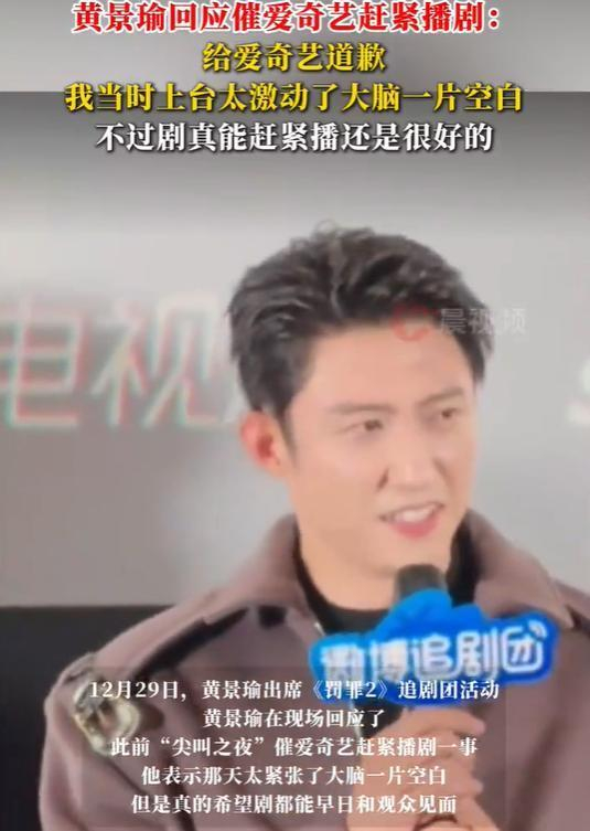 12月29日,黄景瑜出席《罚罪2》追剧团活动,黄景瑜在现场回应了此前“尖叫之夜”催爱奇艺赶紧播剧一事,他表示那天太紧张了大脑一片空白,但是真的希望剧都能早日和观众见面。