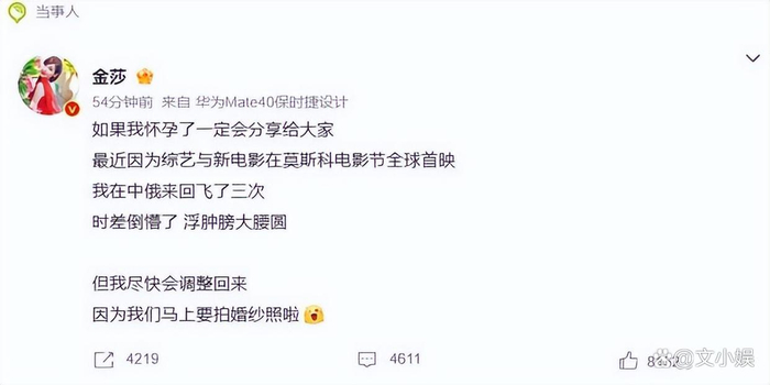 但金莎的回应来得又快又直接。她在微博中详细解释了近期身材变化的真实原因:最近因为综艺录制加上新电影在莫斯科电影节全球首映,她连续在中俄之间往返了三次,时差彻底倒乱,身体出现浮肿,“膀大腰圆”四个字用得毫不留情,自嘲之中透着坦荡。她同时透露,自己和孙丞潇马上就要拍摄婚纱照了,语气里带着藏不住的期待和甜蜜,也间接表明眼下的重心在婚姻事务上,而非生育。