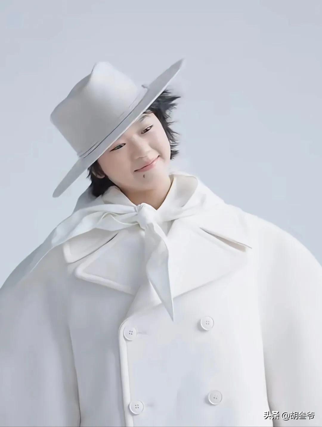 纯白雕塑套装搭配宽檐礼帽,是这组封面中最具氛围感的造型。
