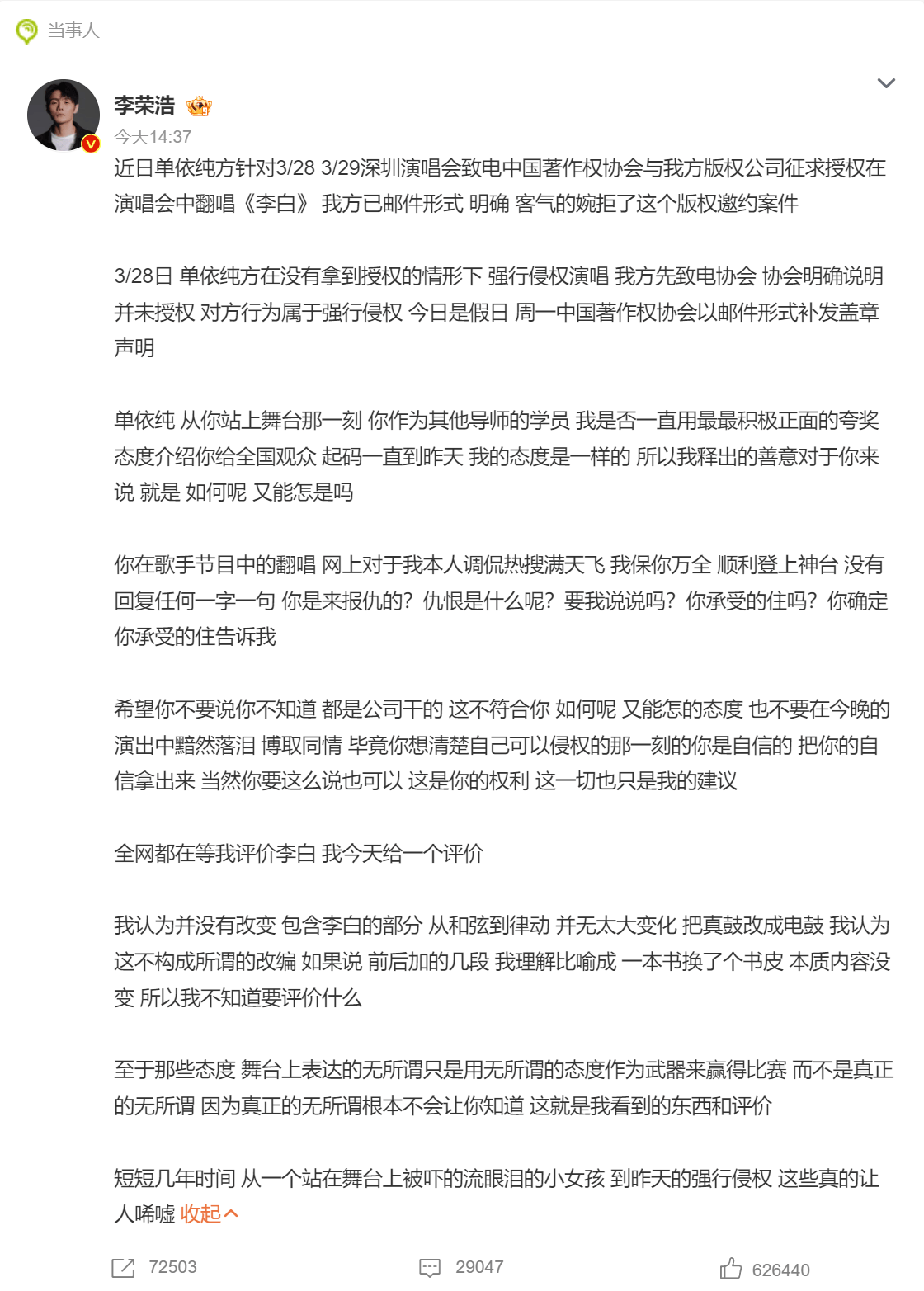 但不好意思,《李白》这首歌从词曲著作权到表演者权都属于李荣浩。通过李荣浩的文字可知,这首歌的权利应该是交给音著协代理,但在没有授权的情况下单依纯唱了,侵权是铁的事实。