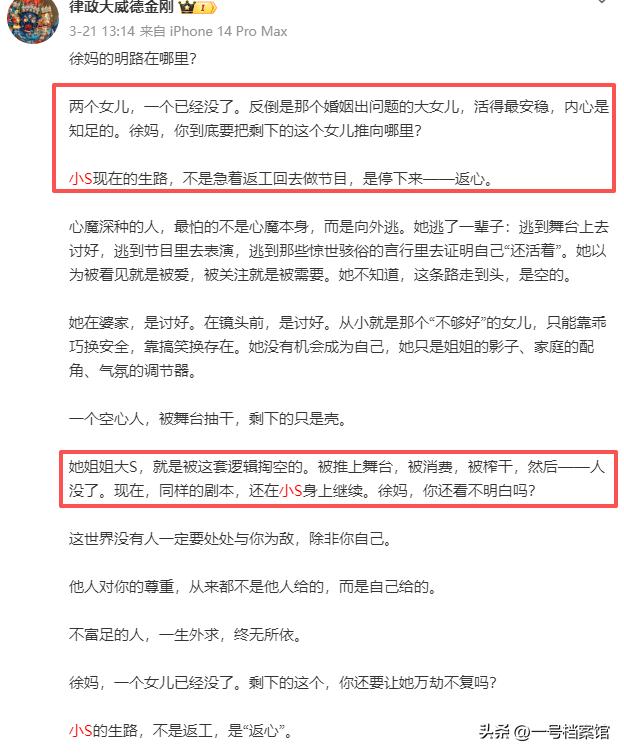 “她姐姐大S,就是被这套逻辑掏空的。被推上舞台,被消费,被榨干,然后——人没了。现在,同样的剧本,还在小S身上继续。”