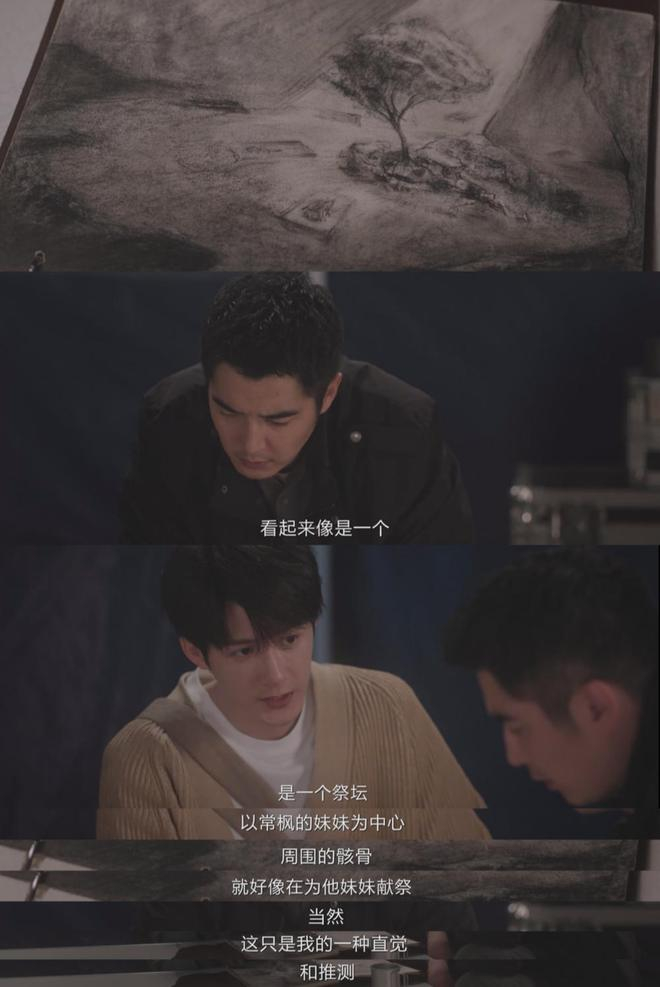 可以说,剧中每个单元刑事案件的侦破,都依赖于沈翊这种“超凡”的探案能力。比如第二个单元盲童采生折割案,沈翊根据盲童画本上的颜色分类,理解盲童的情绪表达方式,进一步了解案件背后的真相;第三个单元自杀山谷突兀海棠树,沈翊通过头骨拼接还原八岁女童的形象,发现坑底布局的奇异之处,察觉出常枫对于妹妹之死的病态执念……