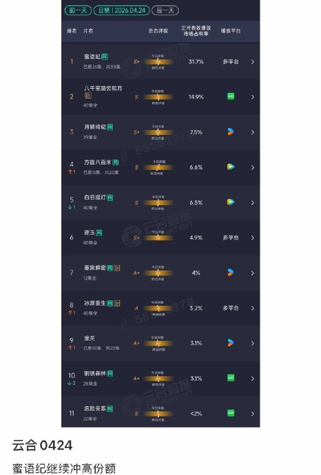 "蜜语纪30.5%"指的是都市剧《蜜语纪》于2026年4月25日创下的单日云合数据市场占有率纪录,这一数据不仅断层领跑同期剧集,更成为2026年第二部单日市占率突破30%的爆款剧,引发行业对"中偶题材复苏"的热议。