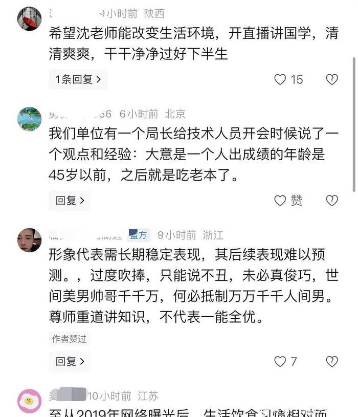 针对此事,有网友评论,希望沈老师能改变生活环境,开直播讲国学,清清爽爽,干干净净过好下半生。有网友表示,至从2019年网络曝光后,生活饮食习惯相对而言改变太多了,最明显的体重增加不少,希望老沈后半生幸福安康!
