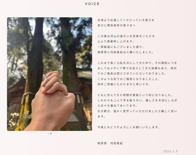 今日凌晨正式在内田有纪官网晒出两人婚戒照