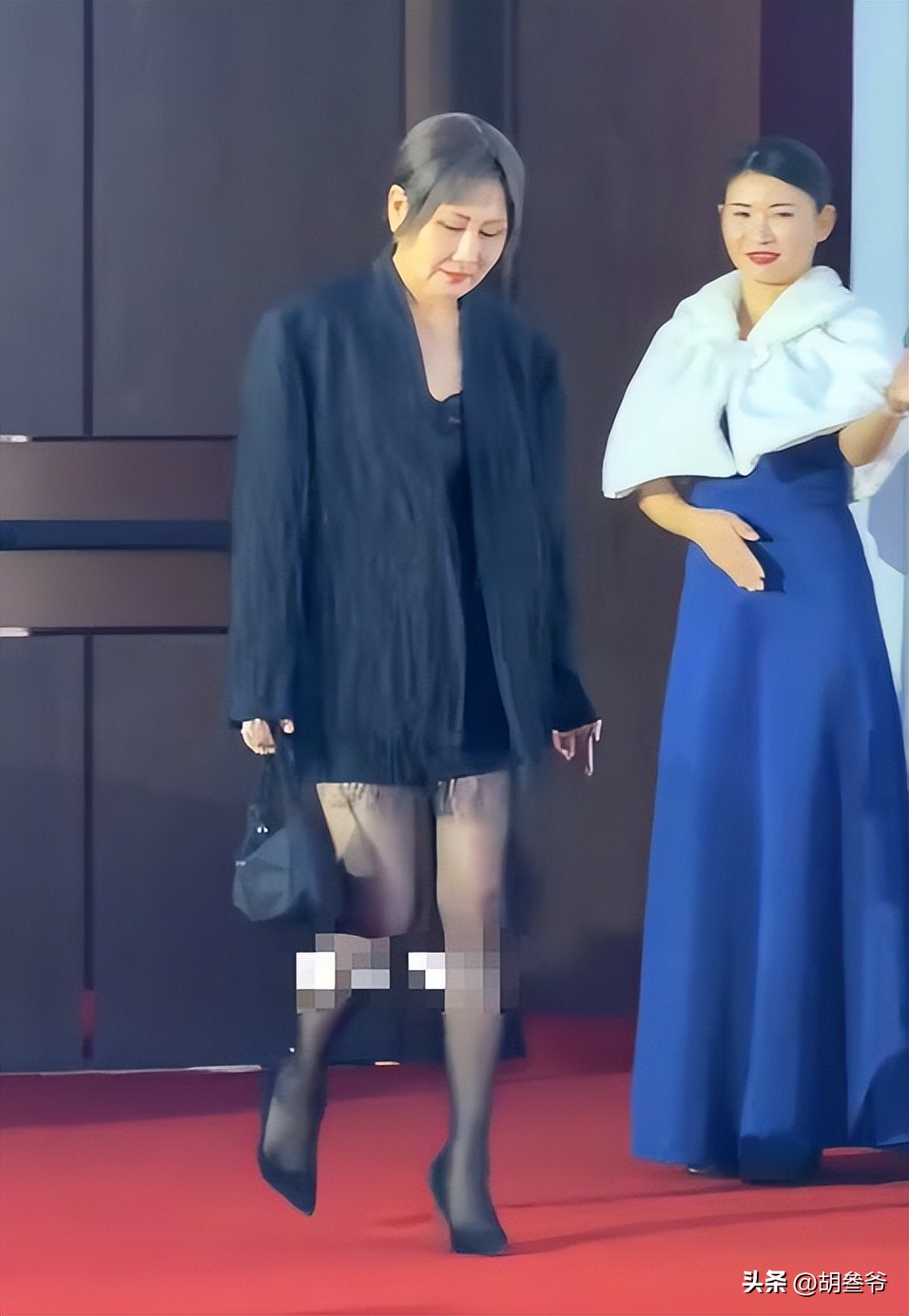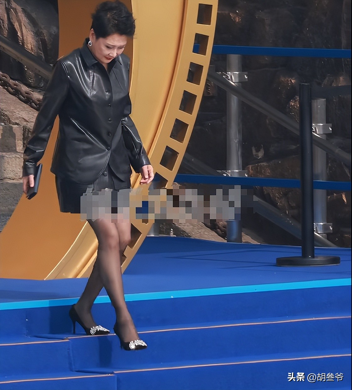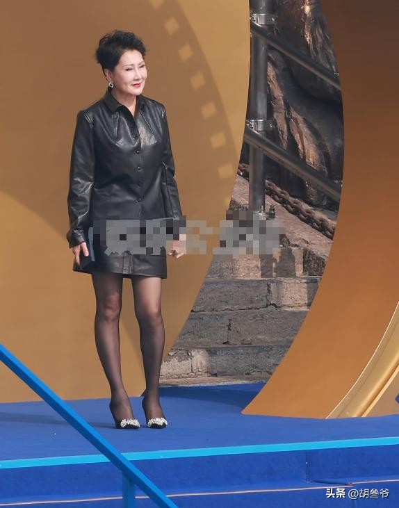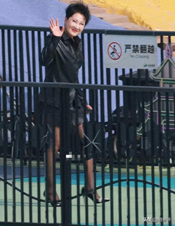 搭配黑丝袜和十厘米高跟鞋,整个人又精神又亮眼,腿部线条紧致,状态好到让人不敢相信这是63岁的人。