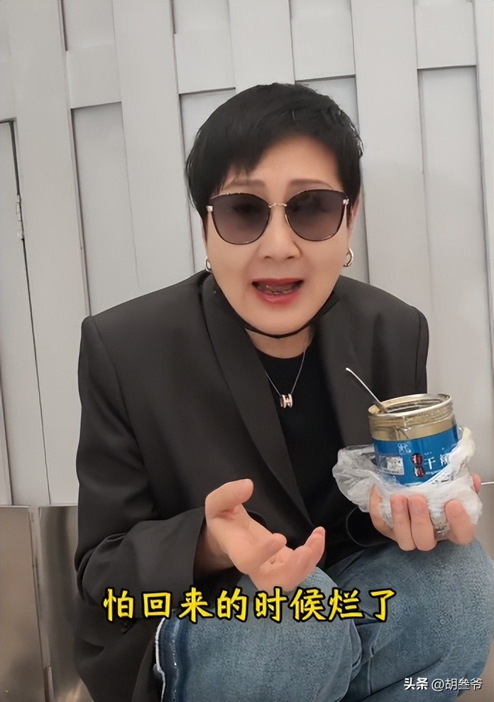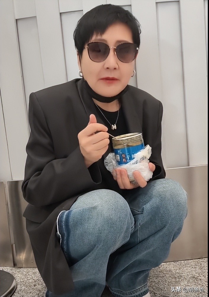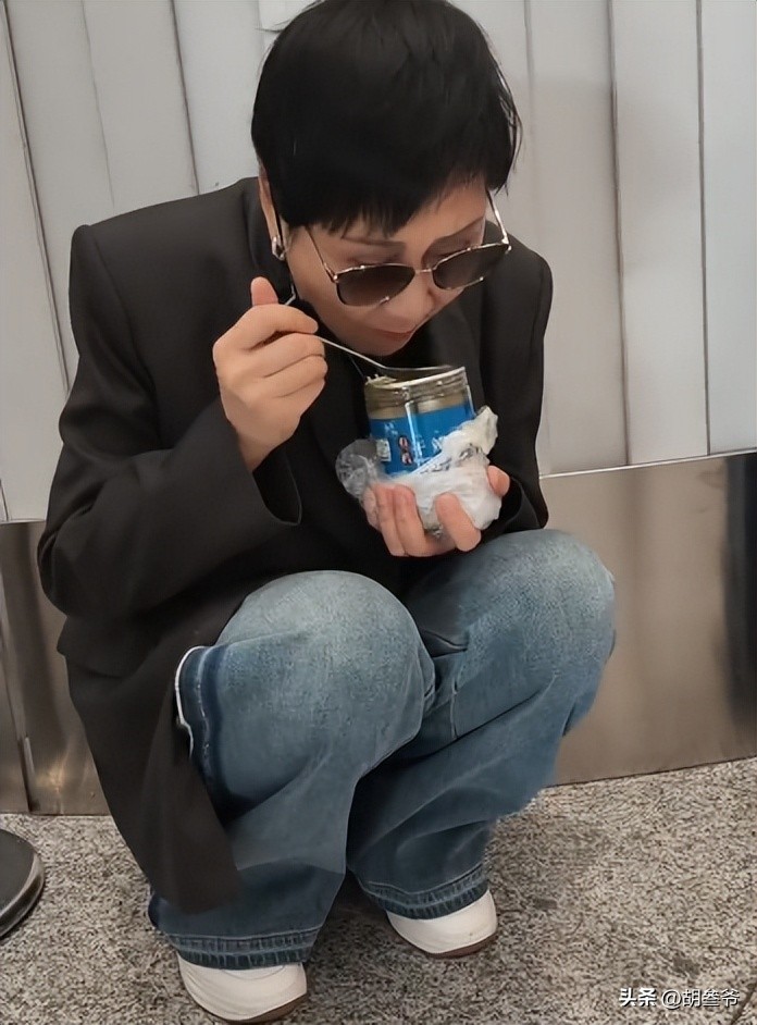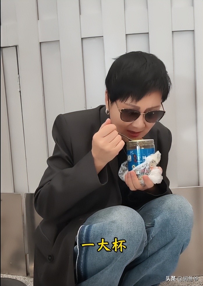 谁也没想到,前几天还在两会上严肃提案、红毯上气场全开的老戏骨,居然在机场角落里蹲成一团,捧着一杯东西埋头猛吃。