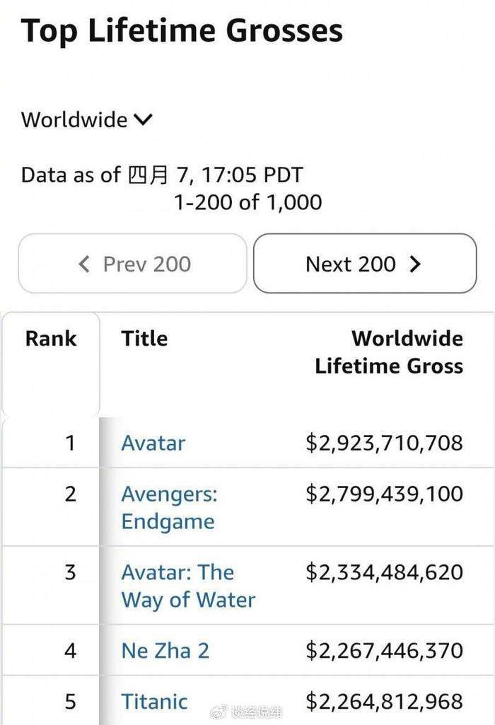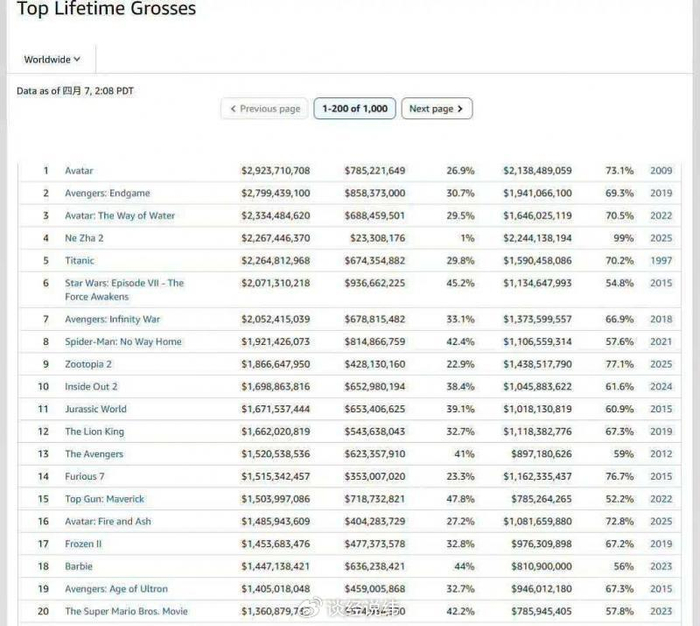 4月8日,权威票房平台BoxOfficeMojo数据显示:《哪吒2》通过补录马来西亚等海外地区票房,全球累计票房达22.674亿美元,以微弱优势反超《泰坦尼克号》,位列全球影史票房第4名。