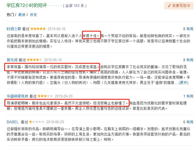 与此同时,在《蜘蛛侠:英雄远征》获得口碑票房双丰收之际,同档热映的《学区房72小时》同样表现不凡,虽然在票房上没有前者抢眼,但口碑上同样获得了不少观众好评如潮。豆瓣一度高达7.0,甚至还有网友在观影后一度好评到“年度十佳。”