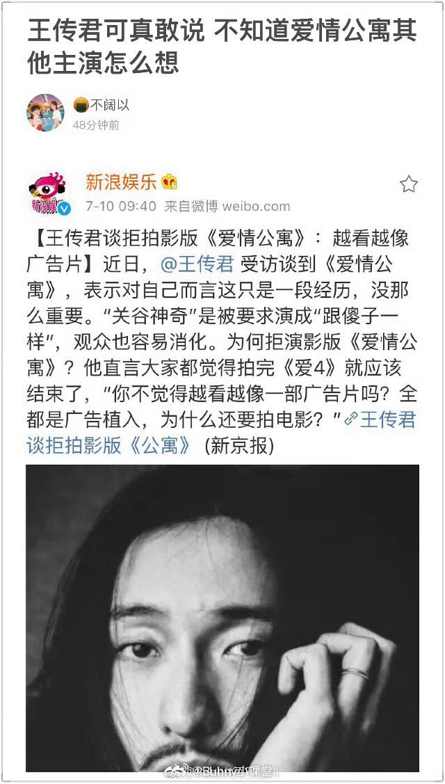 还记得前几年王传君在某次采访中不想别人提关谷神奇这个角色,强调自己的电影是原创,之后更是拒演《爱情公寓》电影版……最近王传君给陈赫新话剧送花篮贺喜,叫他“贤哥”,这是记起来时路了