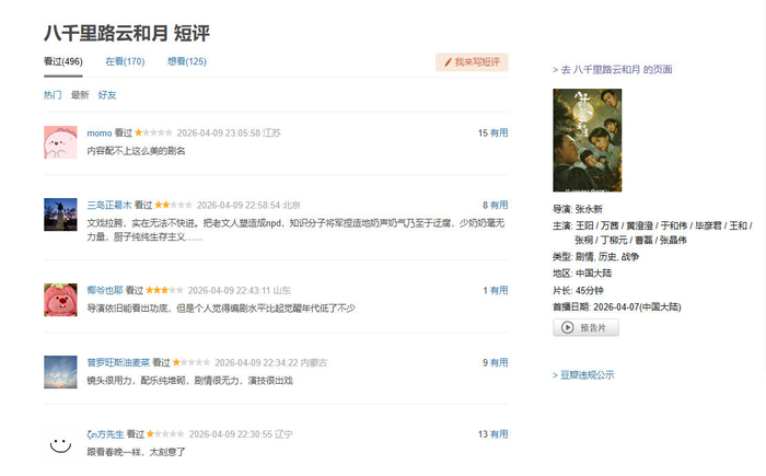 4月10日,电视剧《八千里路云和月》播出至第8集。该剧目前形成的收视率、网播数字和观众口碑情况,可以做一次纵览了。收视率方面,CVB上,该剧首播收视相对一般,次日下滑严重。网络播放数字方面,该剧目前集均刚刚过250万。观众口碑方面,该剧在豆瓣短评区域,已经出现了连成一片的差评。