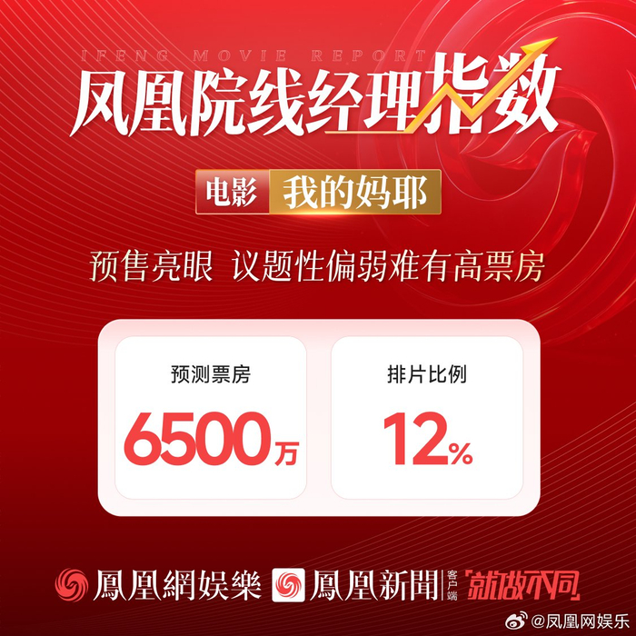 #我的妈耶预测票房6500万##我的妈耶首映口碑#4月3日,由肖麓西执导,@马思纯 @cucn201白客 黄明昊@jjjustin0219 @孙阳_Sunnysun 等主演的电影《我的妈耶》将上映。凤凰网娱乐“凤凰院线经理指数”集结全国多位一线电影院线工作者,对该片进行票房预测。