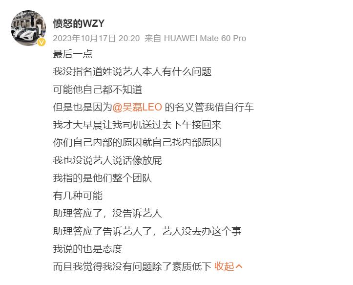 2023年,他公开指控诉吴磊团队借了他的高档自行车拍广告,却拒绝合影。