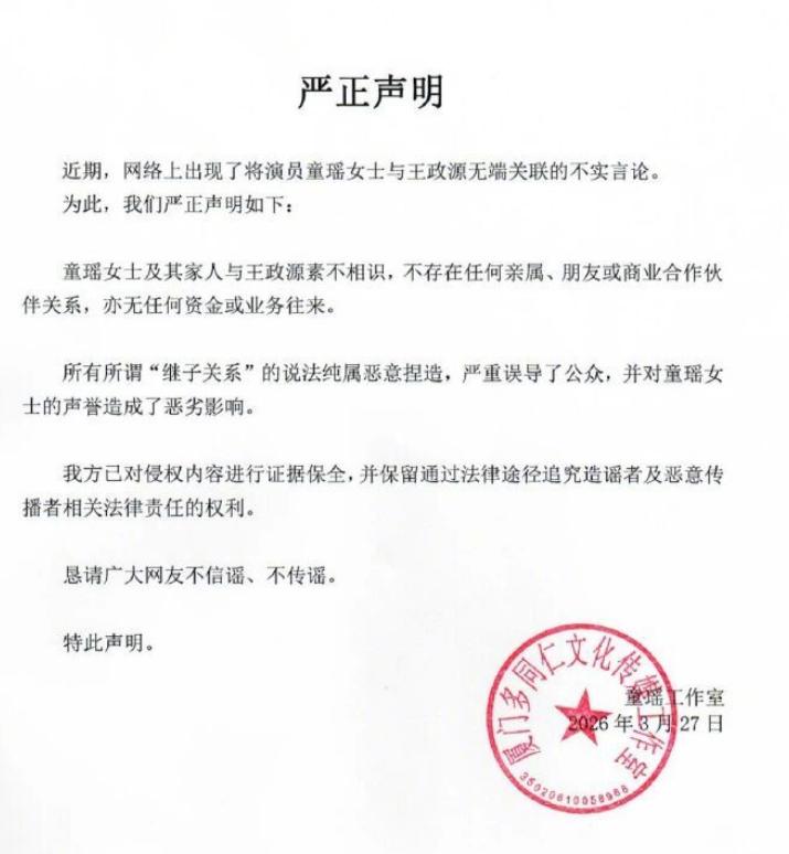 **童瑶不忍了!公开回应与京圈富少真实关系,男方去年刚被判入狱**,一则让人捧腹又无语的传闻在网络上掀起轩然大波:童瑶与某位“京圈富少”关系密切,甚至传言其为“豪门继子”,更有甚者,这位“京圈富少”去年还刚刚被判入狱,案件正在上报,面对这些令人啼笑皆非的谣言,童瑶工作室终于忍无可忍,直接点名否认了所有的关系和资金往来。,### **事件背景:一场臭名昭著的谣言**,这位“京圈富少”实为王政源,年少气盛,靠着“顶级富二代”和“童瑶继子”的人设在网络上走红,这个光鲜亮丽的包装实则是纸醉金钗,背后隐藏着一段灰暗的历史,去年10月,北京市朝阳区人民法院以非法经营罪判处王政源有期徒刑两年六个月,这位“富少”也因此背上了“小白脸”和“骗子”的标签。,网络是信息的狂欢之地,谣言如同流星划过,转眼间就化作了“童瑶继子”的神秘传闻,无数网友开始疯狂扒图,津津有味地围绕“童瑶与富少的关系”发起狂欢,甚至有人直接向童瑶讨要说法,要求她开口道来。,### **童瑶方的强硬回应**,面对这场无稽之谈,童瑶工作室终于忍无可忍,于3月27日发布了一个强硬的声明:,- **“童瑶女士及其家人,与王政源素不相识,不存在任何关系,更无资金与业务往来。”**,这份声明一出,直接点燃了网友的愤怒之情,无数人纷纷力挺童瑶,称赞她“硬刚”,甚至还调侃道:“造谣零成本,难怪童瑶要硬刚,连面都没见过就被扣了这么大一口锅,换谁都忍不了。”,### **真相大白:一场精心编织的骗局**,事实证明,网络谣言往往是一场精心编织的骗局,王政源的“富二代”人设只是表面,其真实身份却是多个案件的卷案,从非法经营到诈骗,他的“名不虞信”已经让不少人望而却步,更令人唏嘘的是,他竟然利用“童瑶继子”的身份,吸引了大量无辜的网友上当,甚至让一些人误入歧途。,而童瑶呢?她靠着自己的才华和努力,早已站稳了脚跟,从《三十而已》中的完美主妇顾佳到如今的多线主演,她的演技和职业生涯都无需依附任何私生活的光环,她的“顾佳”角色不正是最好的证明吗?,### **公众反响:理性与冷静**,面对这场闹剧,公众的反应褒贬不一,有人称赞童瑶“硬刚”,有人为她“疯狂嫉妒”,但也有不少人提醒大家理性看待网络谣言,毕竟,“造谣零成本”并不等于“无代价”,网络不是法外之地,造谣者终将收拾账目。,### **网络谣言的代价**,这场闹剧的最终走向,或许就是网络谣言的必然结局,童瑶的私生活被无端扒拉,王政源的骗局被扑朔出没,真相大白,大家也终于看清了网络谣言的危害。,童瑶靠着自己的努力站稳脚跟,不会因为一些无稽之谈而受损,希望这场风波能让大家以后更加理性看待网络信息,不让无辜的人为别人的骗局和恶意买单背负骂名。,**(本文信息来源:新浪娱乐、钱江晚报、红星新闻、法治视讯、极目新闻等)**