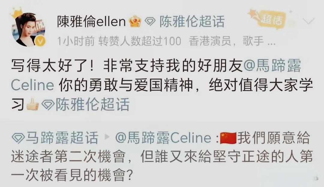 随后,又有艺人陈雅伦转发了马蹄露的信,夸马蹄露很勇敢,值得大家学习。