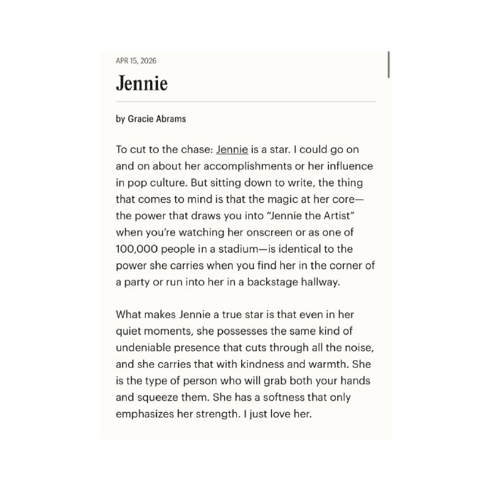 在《时代》杂志刊登的官方评述中,Gracie Abrams开篇直言:“直截了当地说:JENNIE是一位真正的明星。”她摒弃了常规的成就罗列,转而聚焦于JENNIE无法被量化的精神内核——