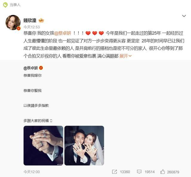 今天,蔡卓妍(阿Sa)官宣结婚的消息登上热搜,紧接着钟欣潼(阿娇)的一篇长文祝福,又直接把“Twins神仙友情”这个话题炸上了天。